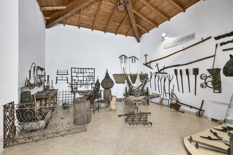 L’ottava sala rappresenta la costruzione storica dello spazio agrario, a partire dalla sua ripartizione ed uso ovvero, la rotazione agraria biennale o quadriennale , basato sulla ripartizione dell’aratorio del villaggio fra bidatzone e poborile terre seminate a cereali e maggese nudo. Due sono le pratiche di cultura materiale che in questo caso qualificano le modalità d’accesso allo spazio. L’attività contadina che ad Aritzo non rivestiva il ruolo di pratica dominante (ancora nel 1935su quasi settemila ettari di suolo appena 126 erano gli ettari coltivati a cereali) con il suo complesso di utensili e macchine che vanno dalle più comuni zappe agli aratri in legno, carri a buoi, gioghi, falci, macchine solfatrici e imballatrici, pale e tridenti per la spulatura del grano, accette, roncole, innestatoi contenitori per l’acqua nel lavoro dei campi borracce di sughero, di zucca, e otri di pelle di capra ecc . .Precede quale attività introduttiva, l’officina del fabbro maniscalco con vasto repertorio di strumenti deputati alla forgiatura di tutti gli attrezzi del mondo contadino nonché alla ferratura del bestiame domito usato nel lavoro dei campi.